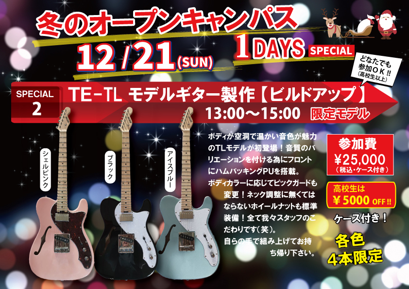 ☆冬のオープンキャンパス☆TLシンラインモデルギター製作体験【ビルドアップ】を開催します!完成後はもちろんお持ち帰り下さい。
