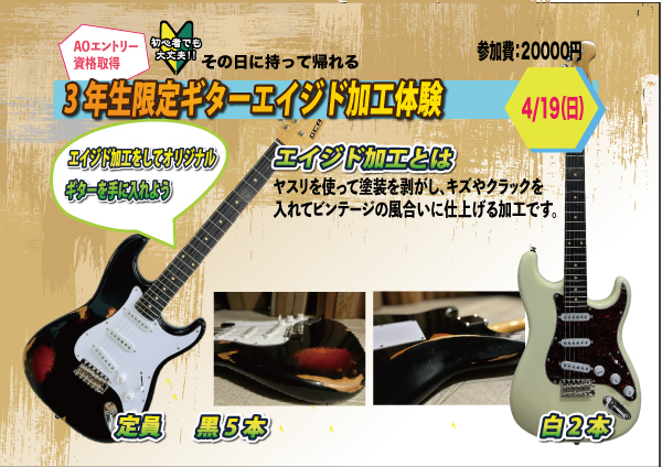色を剥がしスクラッチ傷をあえてつけることでヴィンテージの風合いに仕上げる技術のことで、フェンダー社ではレリック加工と呼んでいます。