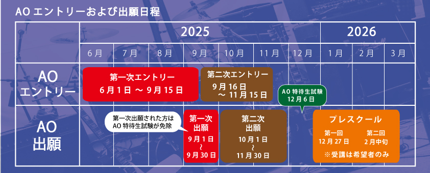 1:オープンキャンパス、学校説明会、オンライン個別相談会に参加2:AOエントリー【第一次 6月1日~9月15日-修了-】/【第二次 9月16日~11月15日】