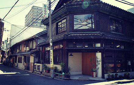 大阪駅から東に徒歩10分程度。商業地から少し離れると、年配の方には懐かしい、若者達には新鮮に感じるであろう古い建物が軒を連ねます。