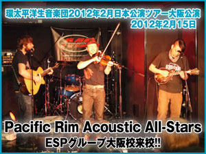 今までも多ジャンルのミュージシャンが来校してきたESPグループ大阪校ですが、今回はとうとうブルーグラスを心から愛する3人が集結した、超絶ハイテクニック・アコースティックトリオの『Pacific Rim Acoustic All-Stars』の日本ツアー大阪公演が行われました(^v^)-☆メンバーのジョーダン・マコンネルさんは、何とカナダでギタービルダーをしているそう!!そこで、GCAの教室にも遊びに来て(!?)くれました☆興味津々で学生の作品を見た後は、8階のライブスペースへGO!!素晴らしい演奏をして下さいました♪