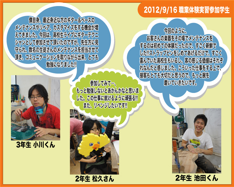 2012年9月16日に、ESPエンタテインメントで行われた【ハイスクールライブIN ESPエンタテインメント】にギターテクニシャンとして参加してきました!!ライブに出演する高校生達の大切な楽器をしっかり調整させて頂きましたよ☆