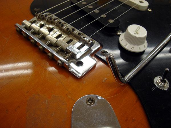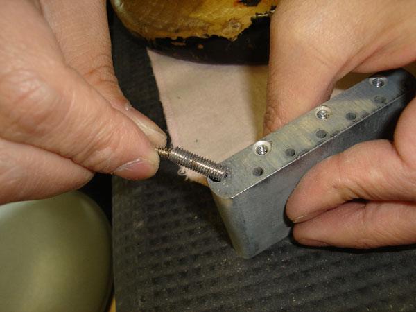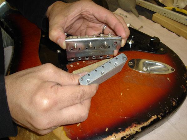 2まずは、ブリッジを取ります。ブリッジを支えているビスを6本、ブロックとプレートをとめているビスを3本を外し分解します。